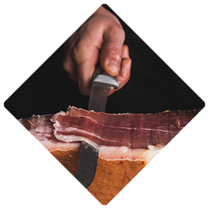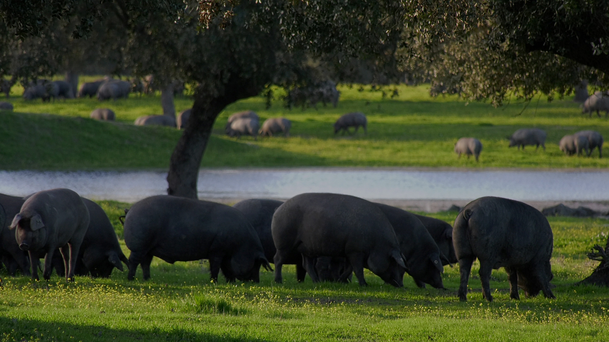 Nos porcs Bellota grandissent en totale liberté dans la Dehesa, en Estrémadure, dès l’âge de deux mois. De octobre à février, ils profitent pleinement des richesses naturelles de ces monts : glands, fruits des bois, tubercules et champignons, se nourrissant jusqu’à 24 mois et consommant jusqu’à 12 kilos de glands issus de nos chênes verts et chêne-lièges séculaires. C’est dans ce cadre hors du temps, entre liberté et quête constante de nourriture, que naissent de véritables joyaux gastronomiques — jambons et épaules aux propriétés organoleptiques incomparables, reflet d’un terroir et d’un savoir-faire uniques.