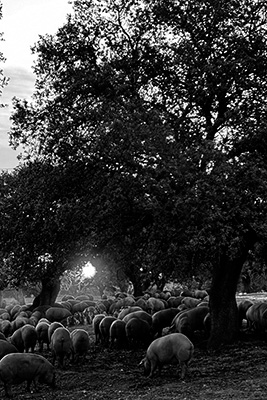 Nos porcs Bellota grandissent en totale liberté dans la Dehesa, en Estrémadure, dès l’âge de deux mois. De octobre à février, ils profitent pleinement des richesses naturelles de ces monts : glands, fruits des bois, tubercules et champignons, se nourrissant jusqu’à 24 mois et consommant jusqu’à 12 kilos de glands issus de nos chênes verts et chêne-lièges séculaires. C’est dans ce cadre hors du temps, entre liberté et quête constante de nourriture, que naissent de véritables joyaux gastronomiques — jambons et épaules aux propriétés organoleptiques incomparables, reflet d’un terroir et d’un savoir-faire uniques.